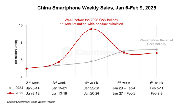 近日,市调机构Counterpoint Research在报告中指出,2025年,国家对手机销售的补贴政策点燃了中国的智能手机市场,1月20日至26日当周智能手机销量同比增长近65%,达到超过950万部,并在接下来的几周保持高水平,尽管农历新年假期期间经济活动减弱。第四周同比增长近65%,表明补贴政策的早期反应良好,也符合中国消费者将比计划更早更换或升级智能手机,从而在短时间内产生更多需求的假设。